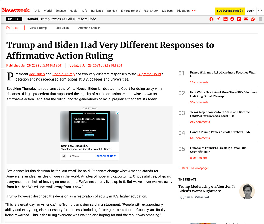 Newsweek: Affirmative   ⎮  BBC: Trans  ⎮  Politico: Settlement  ⎮  Politico: Online  ⎮  CBS: Bans  ⎮  Politico: Radical  ⎮  Forbes: Biden - Trump  ⎮  Discussion Board